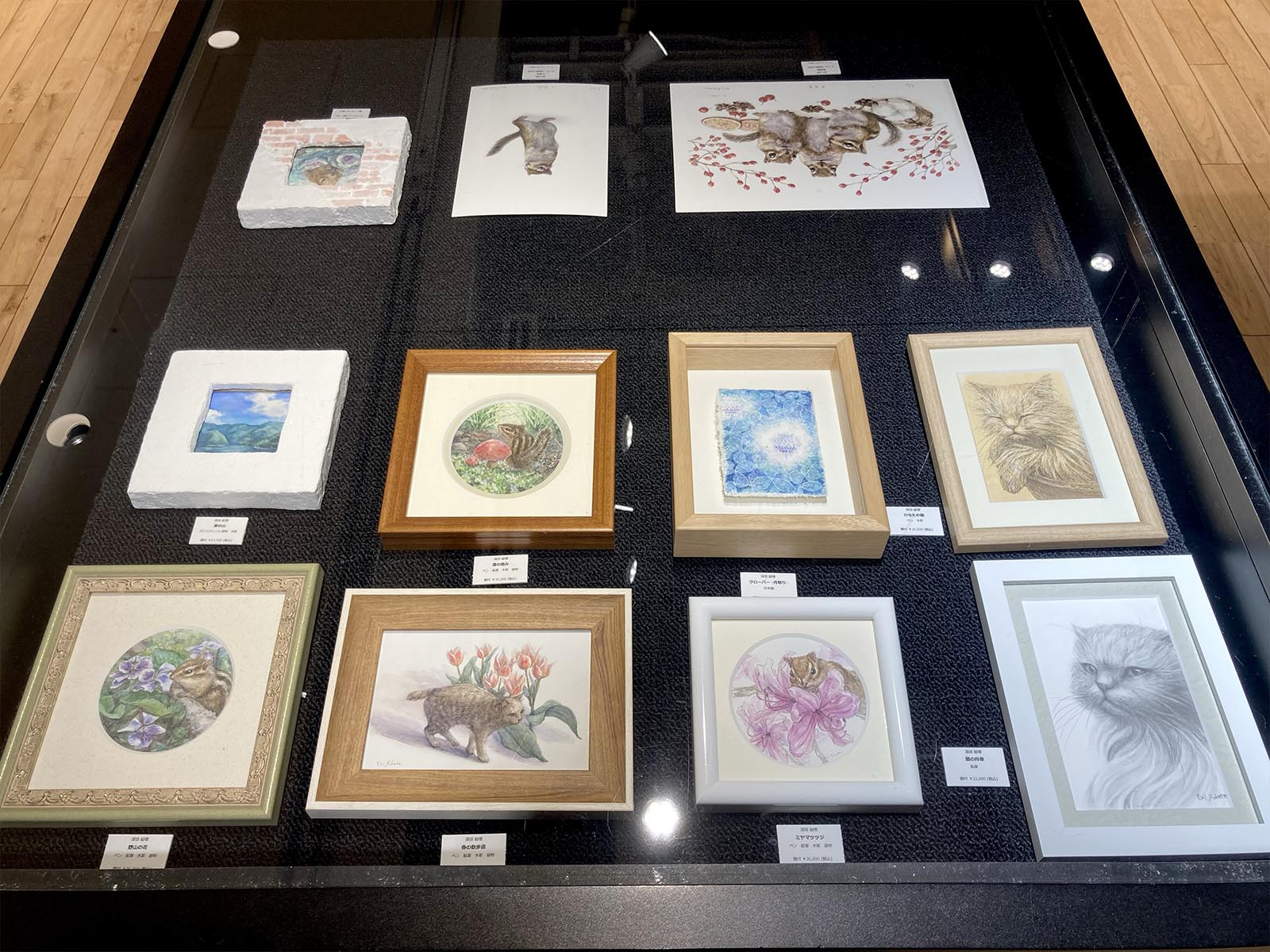 リスと新作のヤマネシリーズをメインに展示しています。グッズも置いてます。