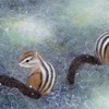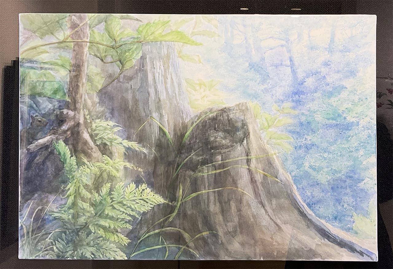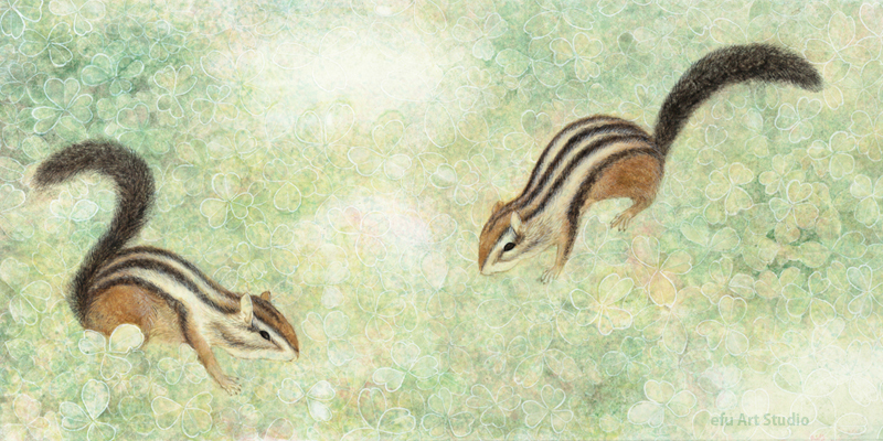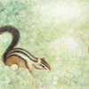 森を駆けまわり、植物と戯れるリスたちのいる景色を描きました。