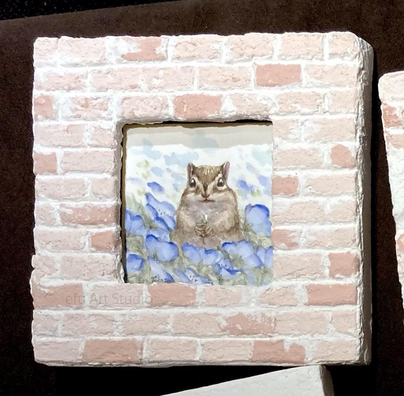 今回は手作りの漆喰のフレームや額縁を窓に見立て、窓の向こうの森の景色の中で駆け回る小さな動物たちの姿を眺めるイメージで作品を作りました。